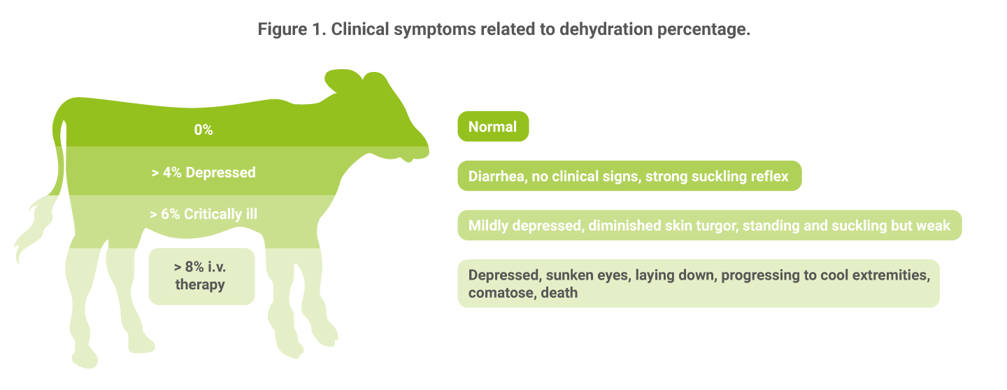 In calves, metabolic acidosis is a common result of diarrhea-induced dehydration. Without treatment, metabolic acidosis is a prime factor in the death of many of these calves. Early and intensive oral electrolyte therapy at the onset of diarrhea in calves is critical to replenish fluids and correct metabolic acidosis. Therapy should be started as soon as possible regardless of whether evidence of dehydration is seen. The clinical signs of dehydration are not obvious until the calf has lost at least 6 % of its body weight in fluid (figure 1). The course of therapy depends on the severity of symptoms. Calves still able to stand and suckle can often be treated with oral rehydration solutions alone to avoid continued fluid losses and restore extracellular cell fluid volume. If there are signs of systemic illness, a veterinarian should be consulted for additional therapies such as anti-inflammatories or intravenous fluids.