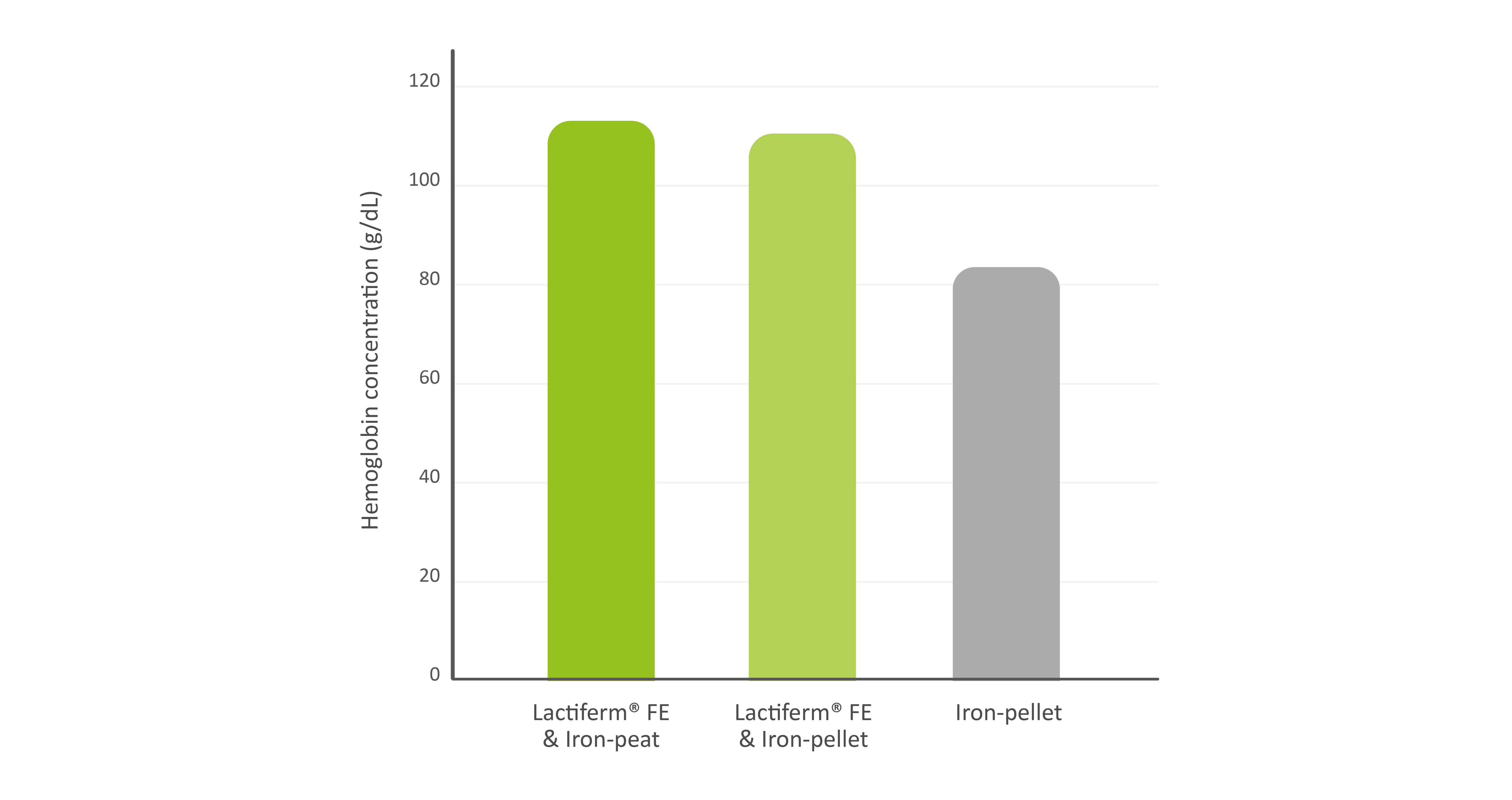 The hemoglobin level can be used to define an optimal supply. A comparison of oral iron applications is shown in Fig. 2. A single administration of Lactiferm® Fe paste (iron fumarate + probiotics + vitamins) in combination with an iron-containing peat or pellet (until weaning) was tested. In contrast to the purely voluntary intake of a pellet, the combination of Lactiferm® Fe with peat/pellet shows a sufficient hemoglobin level, which suggests an optimal supply for a suckling piglet.